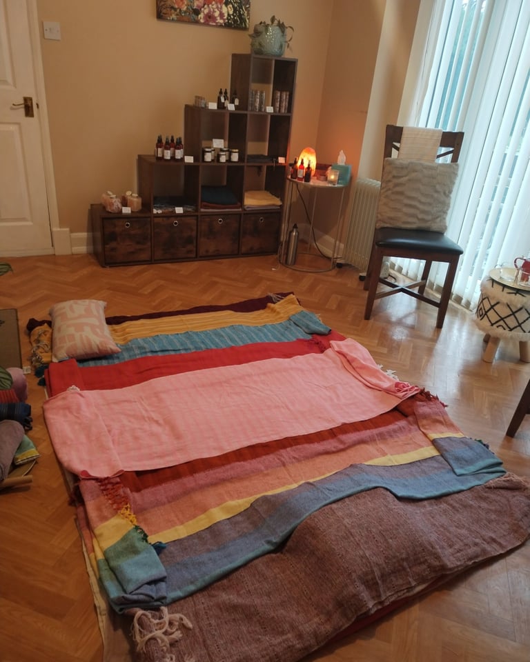 Now you are ready to be wrapped in a gentle snug cocoon in the nurturing hold of the Rebozos from top to bottom allowing you to enter a beautiful deep state of relaxation and Theta state healing.